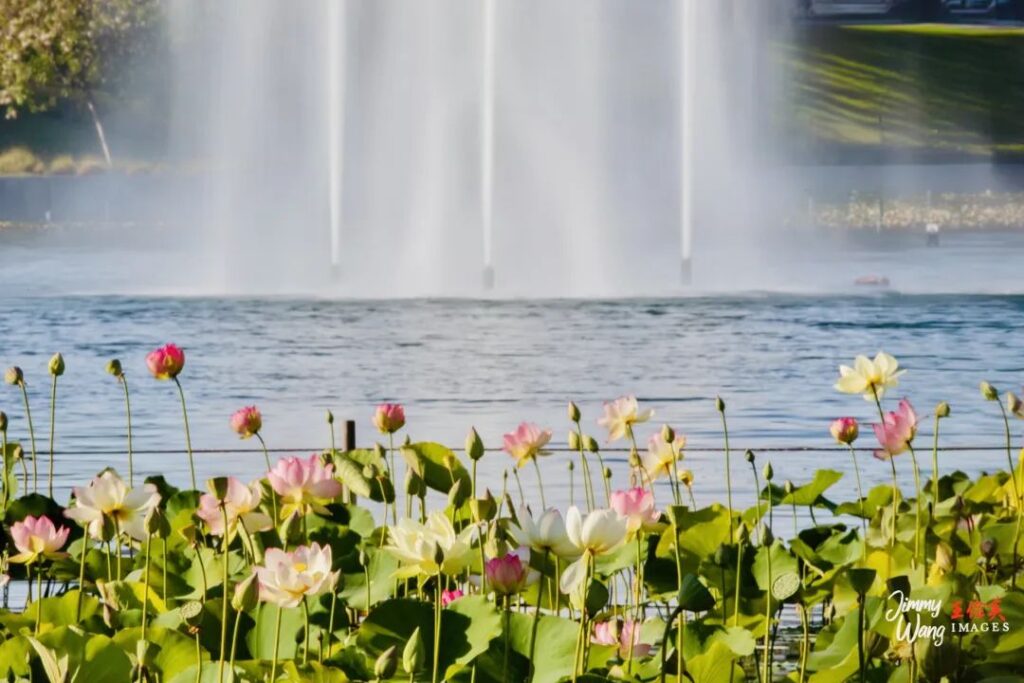 洛杉矶回声公园(Echo Park)荷花盛开,这是亚洲之外,规模最大的荷花池。喷泉的水花在阳光下飞溅,娇艳的荷花竞相开放,色彩斑斓。