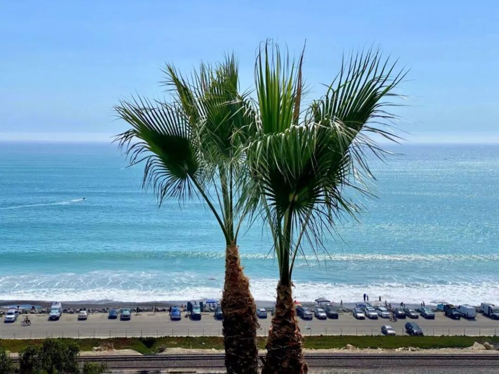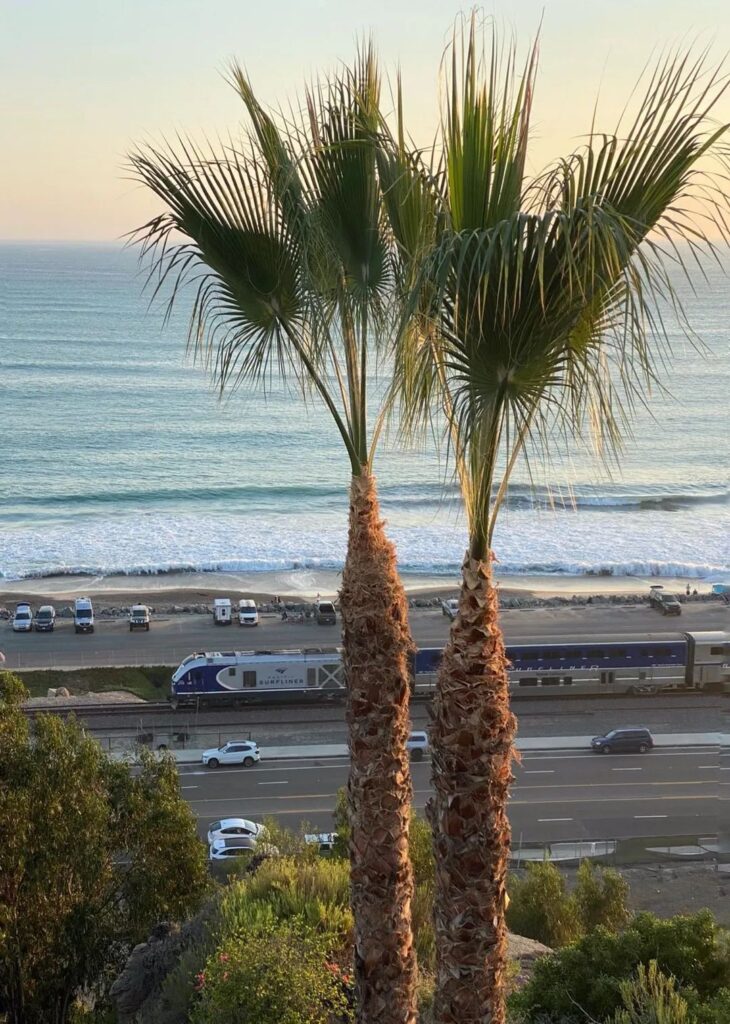 接昨日,继续手机、相机拍摄海滨渡假屋。图1,修剪一新的棕榈树下驰过开往圣地亚哥的火车。