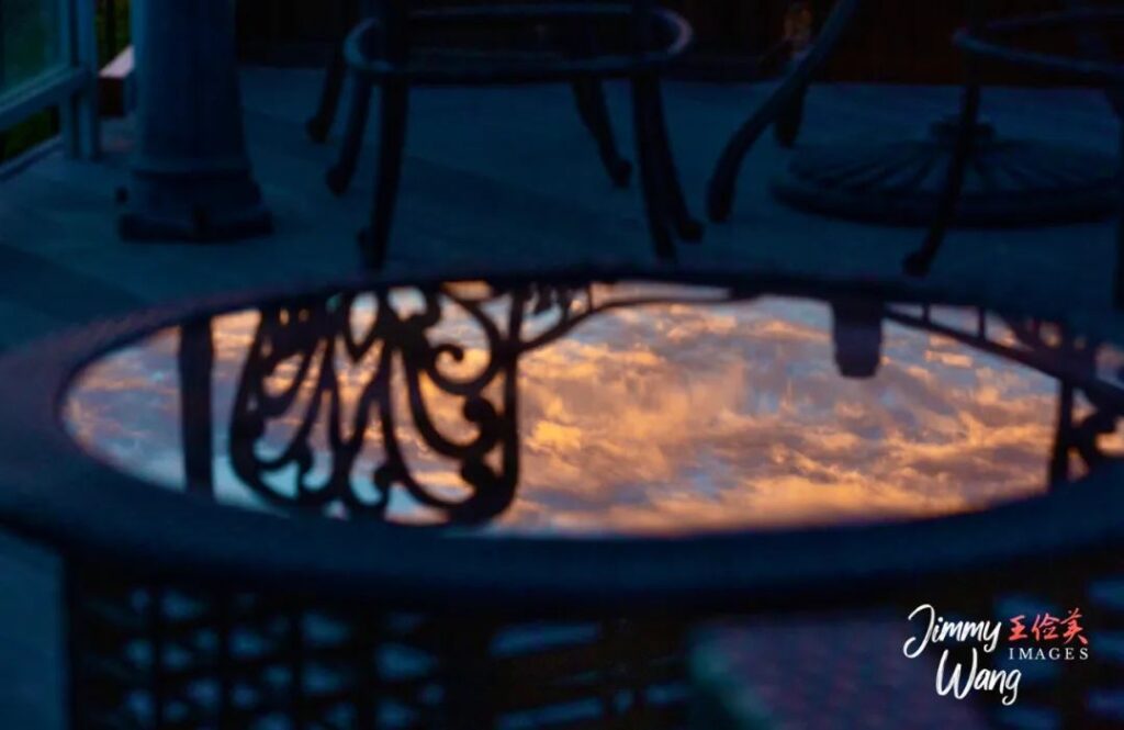 两棵棕榈树与一个夕阳,落霞满天,映红阳台上的茶几玻璃罩面,颇像冬天里柴火旺盛的壁炉。