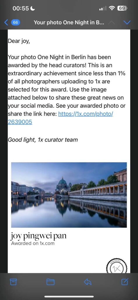 翻出初访柏林的文字,感慨万千;今日第二次握手,风光摄影作品被全球著名网站1X.com选登并获主评委奖赏,斩获意外的惊喜一枚。就是这样有趣可爱的德国之旅。