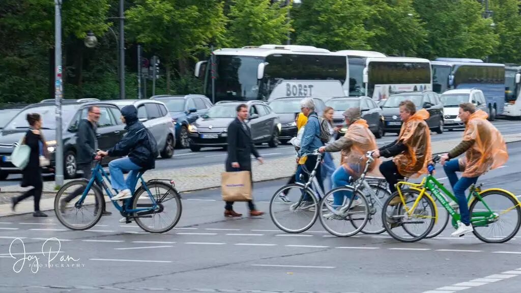 图3是柏林人的日常生活,他们环保意识强,喜欢骑自行车上下班或以其它方式出行。