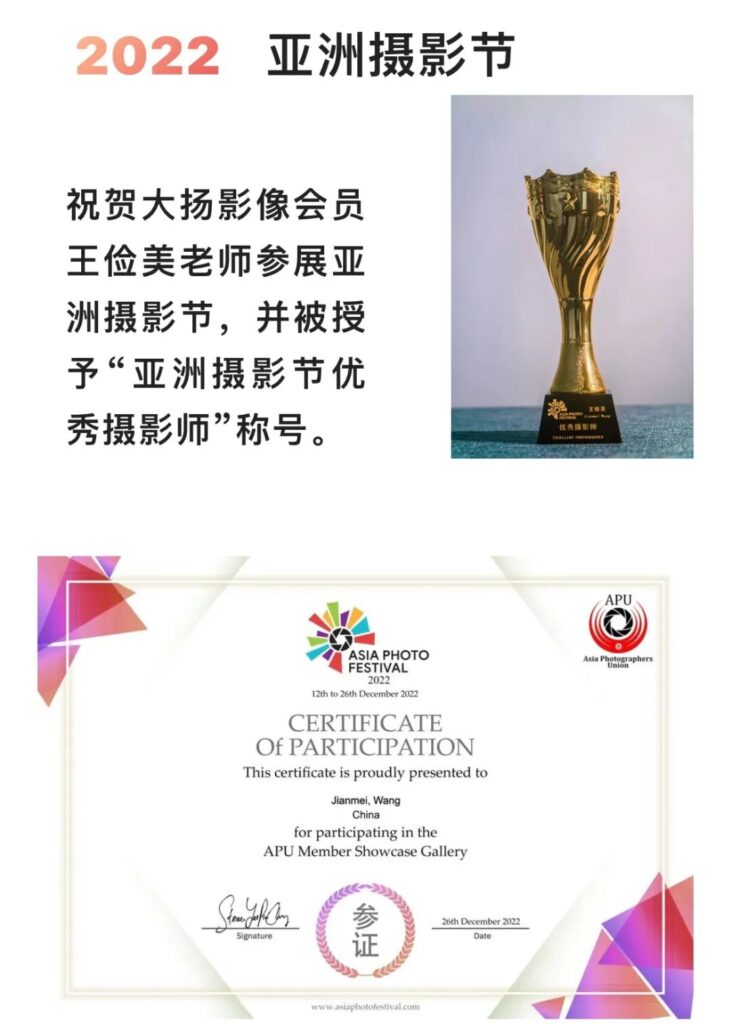 王俭美荣获“亚洲摄影节优秀摄影师”称号。2022年12月12日,亚洲摄影节拉开序幕,此次摄影节以“我的照片”为主题,全球46个国家435名摄影师的作品进行了在线展示,打造一场视觉盛宴。据悉,王俭美此次参展的组织机构上报40名摄影人的作品,共有9人获得“优秀摄影师”称号。