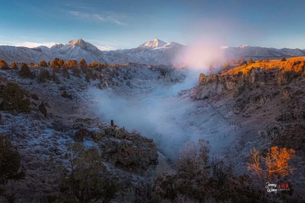 雪山热泉映朝辉。