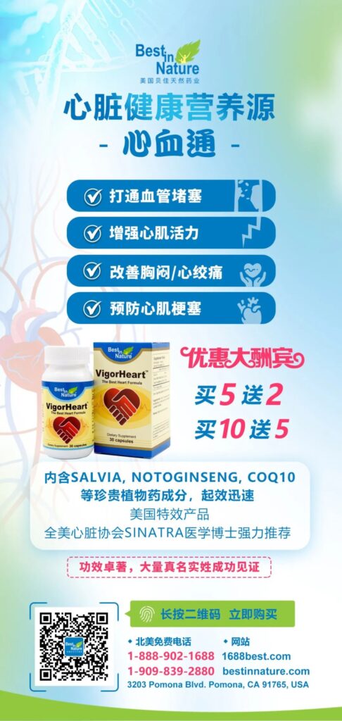 美国专利产品【心血通 VigorHeart】(专利号US Patent #9561272,#9017697)由天然珍贵植物药成分Salvia、Notoginseng,及CoQ10等等根据“群聚效应”构成,配方完美。【心血通】的活性有效成分,把沉淀和粘附在冠状动脉血管壁上的血栓(Blood Clot)及脂纹斑块(Fatty Deposits)溶解掉,打通冠状动脉堵塞,抑制血栓形成与再形成。