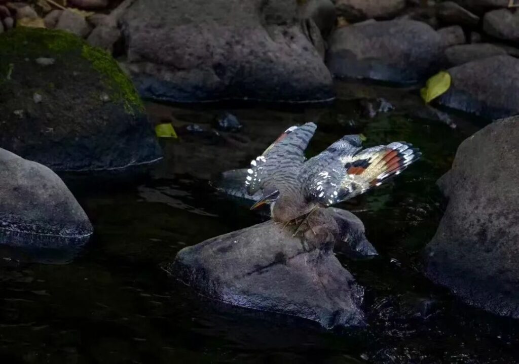 哥斯达黎加摄鸟记(之三)。图1,一只鸟儿伫立在溪石上,张开双翅,蓄势待飞。翅上白点斑斓,掺杂橙黑羽纹,灰褐色的身形与湿润石色融为一体,像极了五彩的出土毛质挂毯。初步判断,应为栖息于热带溪流的虎斑凤头鹃(Tiger Heron)。