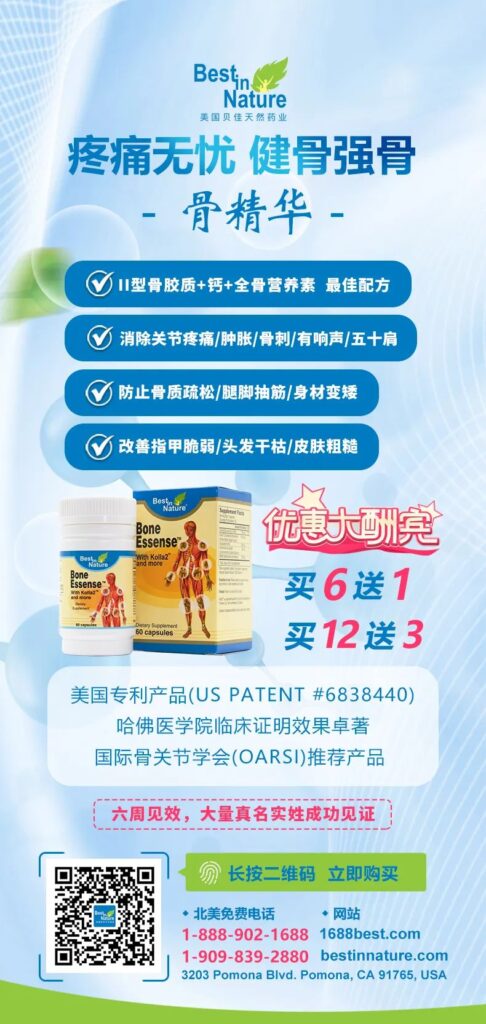 【骨精华】美国专利号为U.S. Patent # 6838440,突破以往几十年全球对骨保健的研究,是当代骨科学的一项创举,哈佛大学医学院等临床研究证明其修复软骨磨损,消除关节疼痛,延缓骨质疏松效果显著。