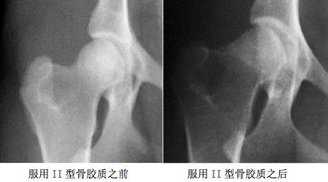 2006年3月9日,美国专利Kolla2 研究团队经过临床试验证明服用【骨精华】主要成份II型骨胶质(kolla2)六周后,患有关节发育异常的犬科动物恢复了正常运动功能,随后的X光射线显示髋关节软骨明显增厚,恢复正常。以下为服用II型骨胶质Kolla2前、后X光对比图: