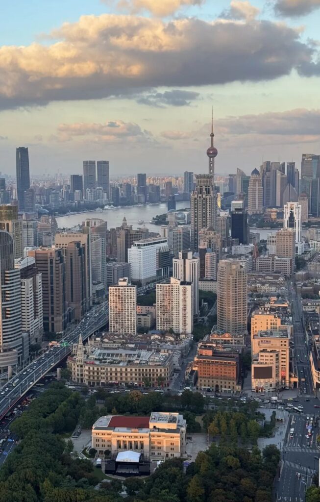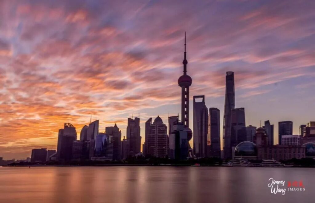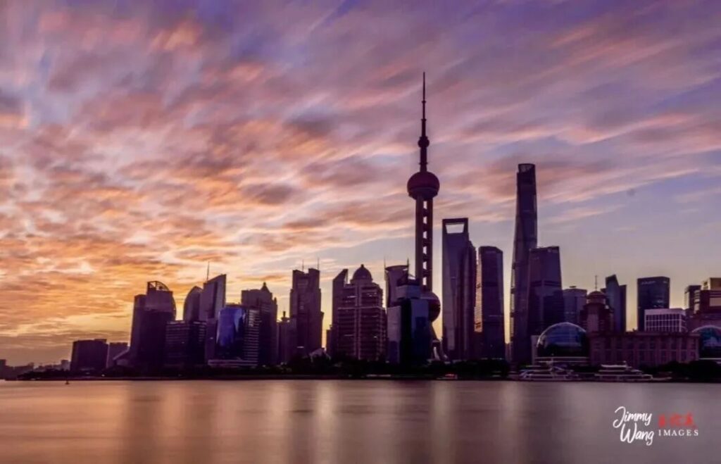 黄昏时分,夕阳的余晖洒在城市的建筑上,为画面增添温暖的金色,还有那种神秘莫测的孔雀蓝,为魔都披上神秘的面纱。