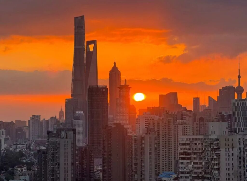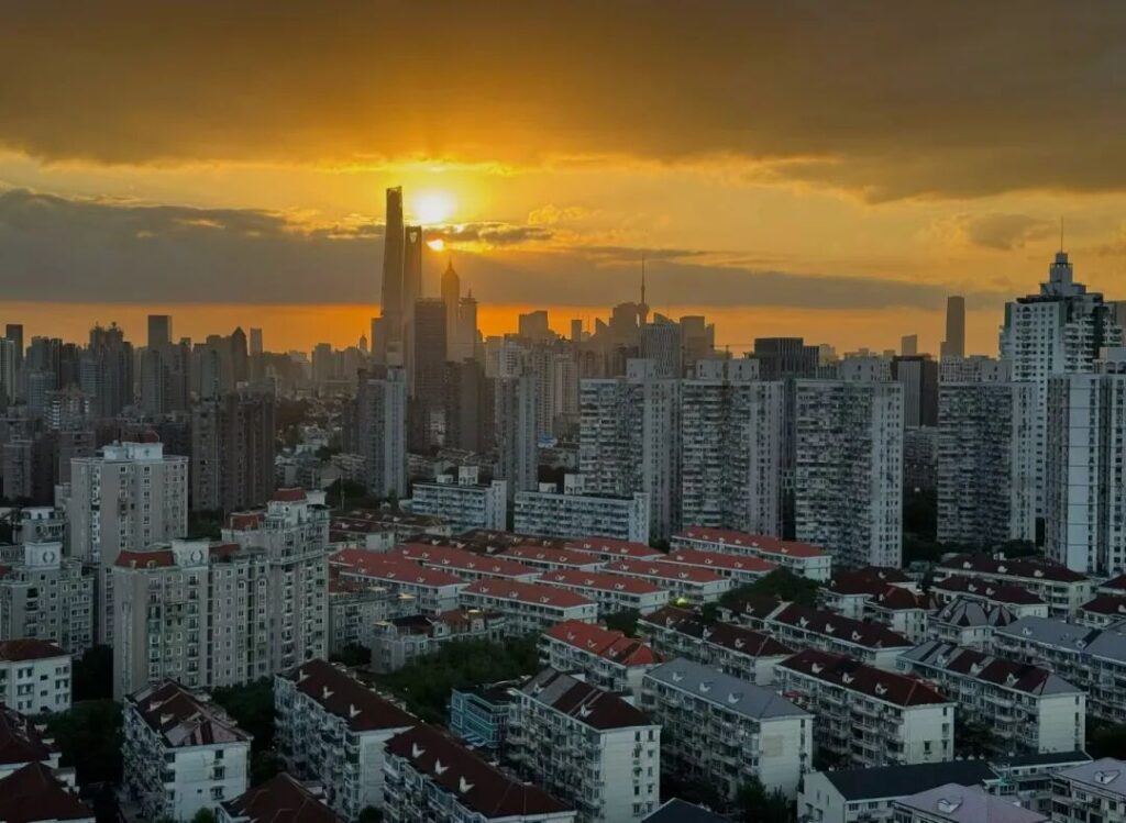 航拍地摄魔都上海(之三)。图1,上海日落时分,红瓦居民楼与摩天高楼交织,夕阳在云端与高楼间洒下金辉,天空橙黄绚烂。