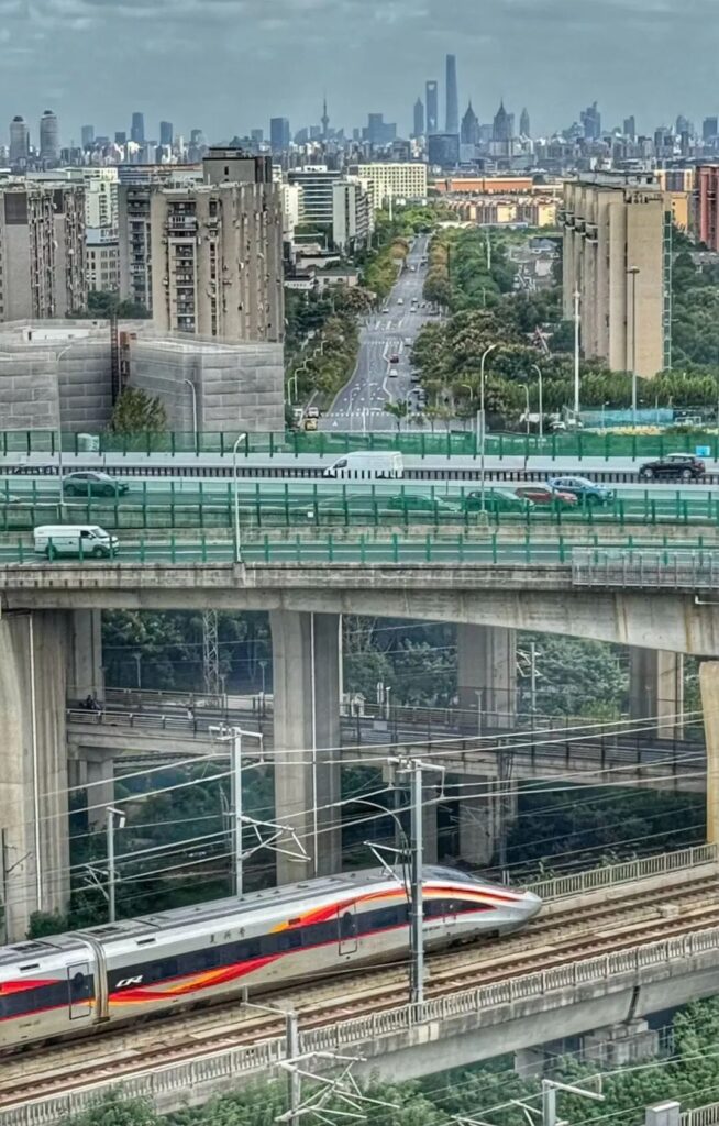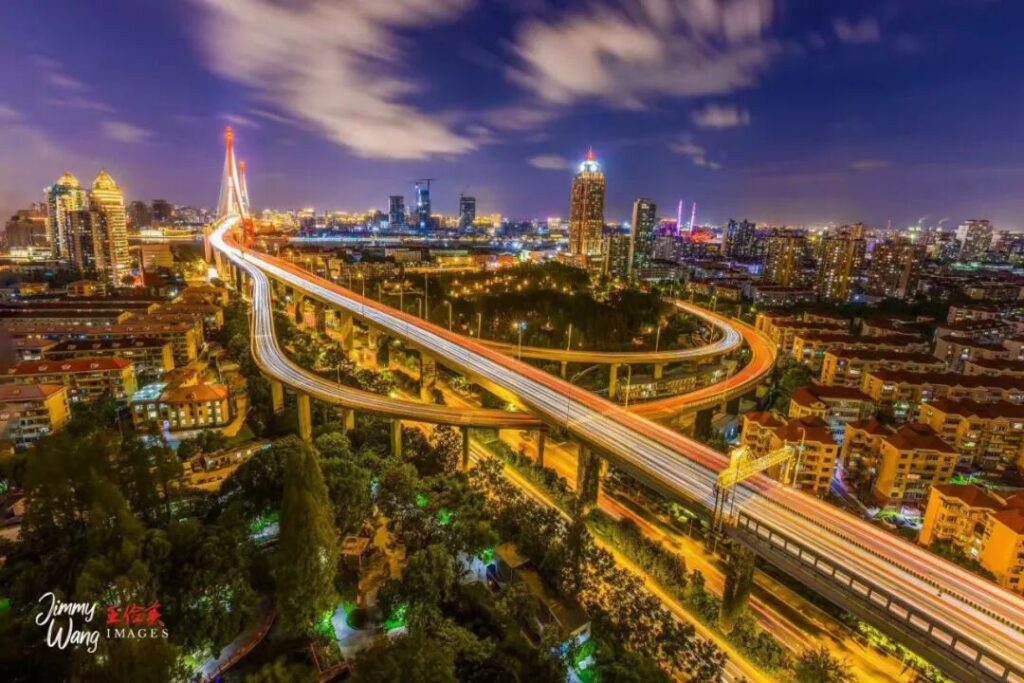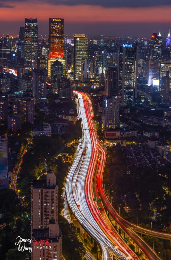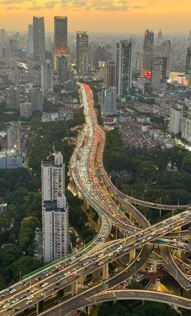 层层叠叠的上海交通,城市的脉络在此显形。高架桥如银蛇盘绕,车流穿梭成光的溪涧,每一道曲线都是城市蓬勃的心跳。