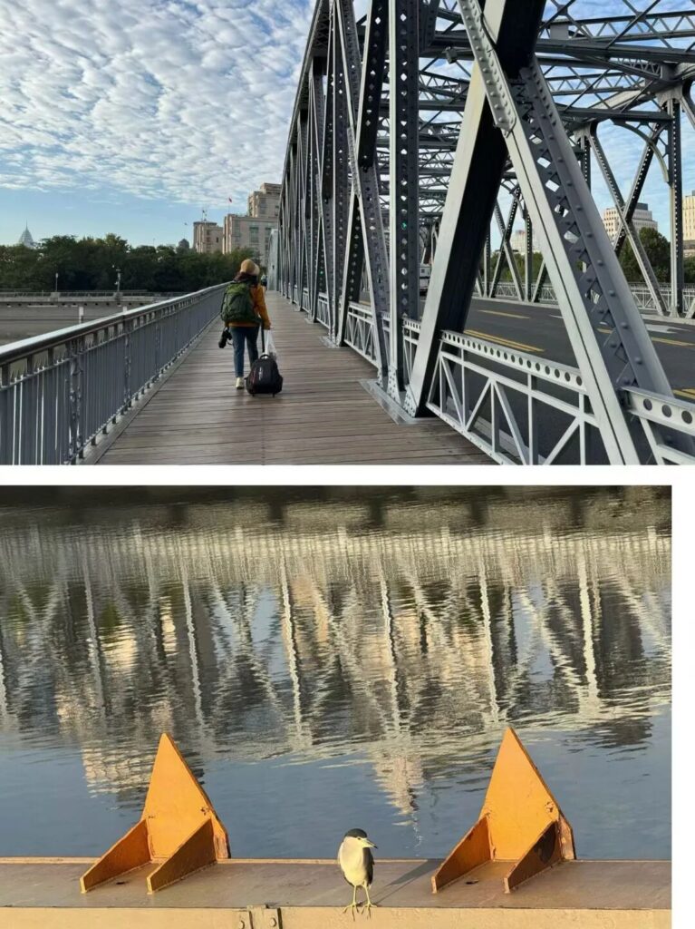 一只夜鹭静立水边,与远处的桥影构成一幅动静相宜的晨景,它的静默与江涛的轻喃,交织成上海清晨的复调,展现其显现或隐匿的宁静与活力。