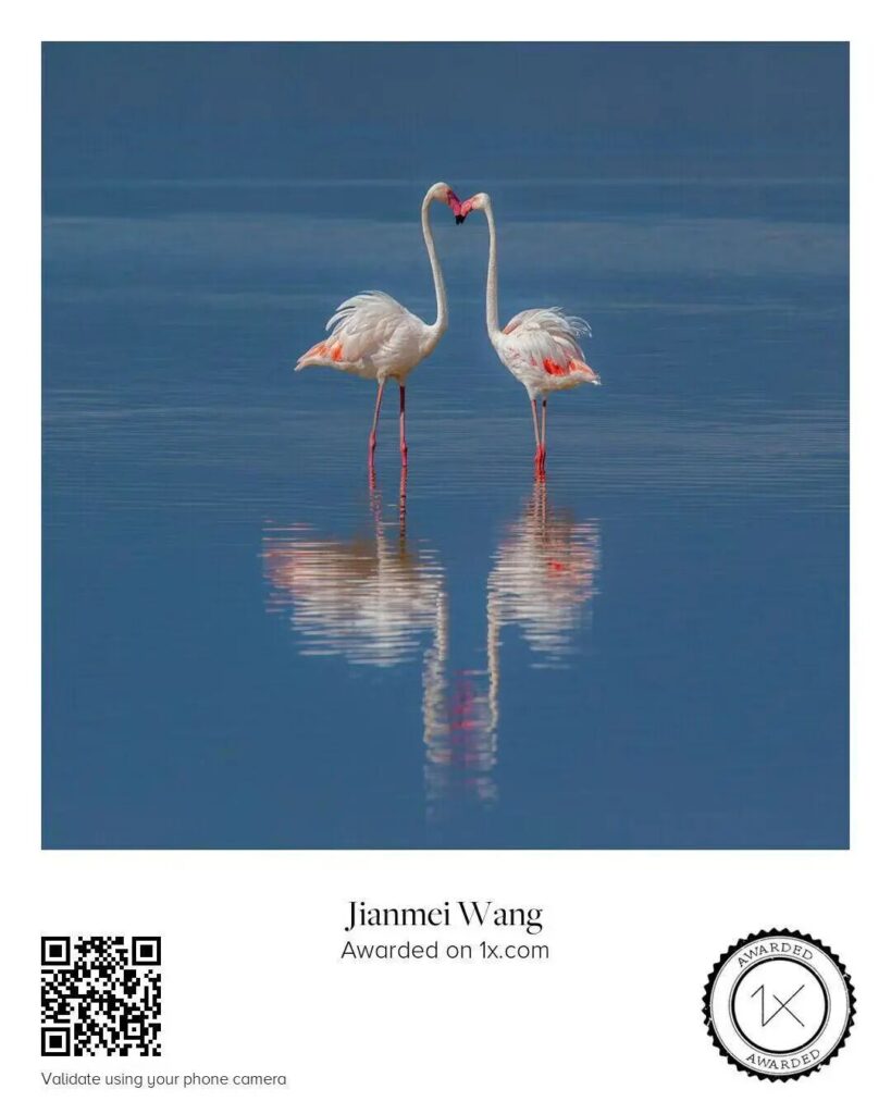 两只火烈鸟在平静如镜的湖面上相对而立,细长的脖颈交汇成爱心形状,倒影在水中延伸出一份对称而浪漫的美感。