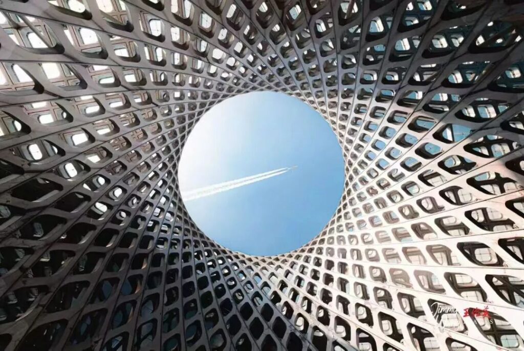深圳行摄( 之三 )。走进深圳体育馆,举首邂逅一方被结构镂刻的蓝天。恰有飞机悠然渡影,为静止的穹顶带来一瞬流动的诗句。