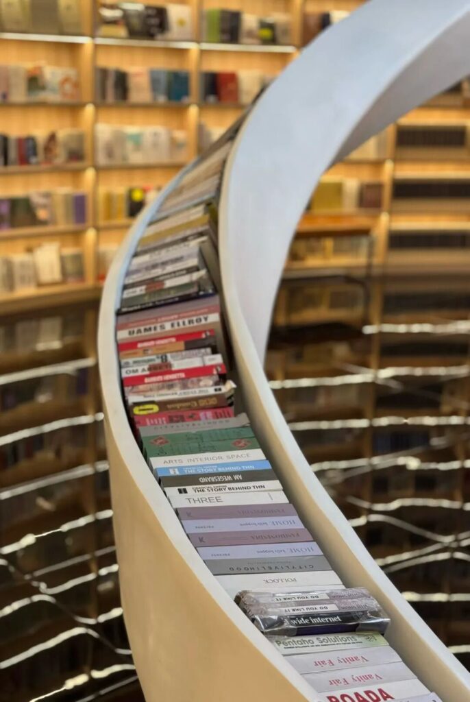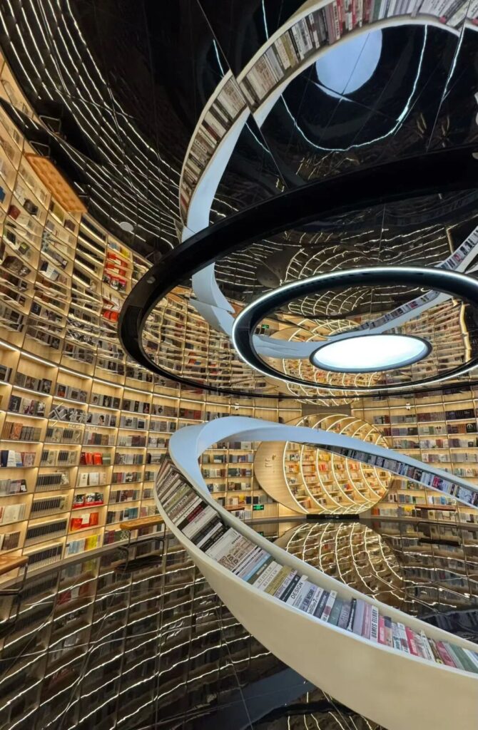 深圳行摄( 之四 ),手机随拍。步入深圳愈欣书店,螺旋书架蜿蜒如梦,灯光勾勒出奇幻轮廓,暖光勾描知识曲线的魅影,镜面倒悬书海浩瀚。