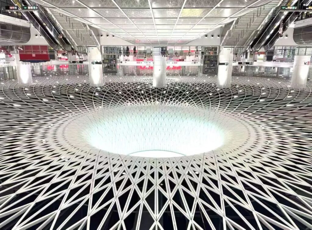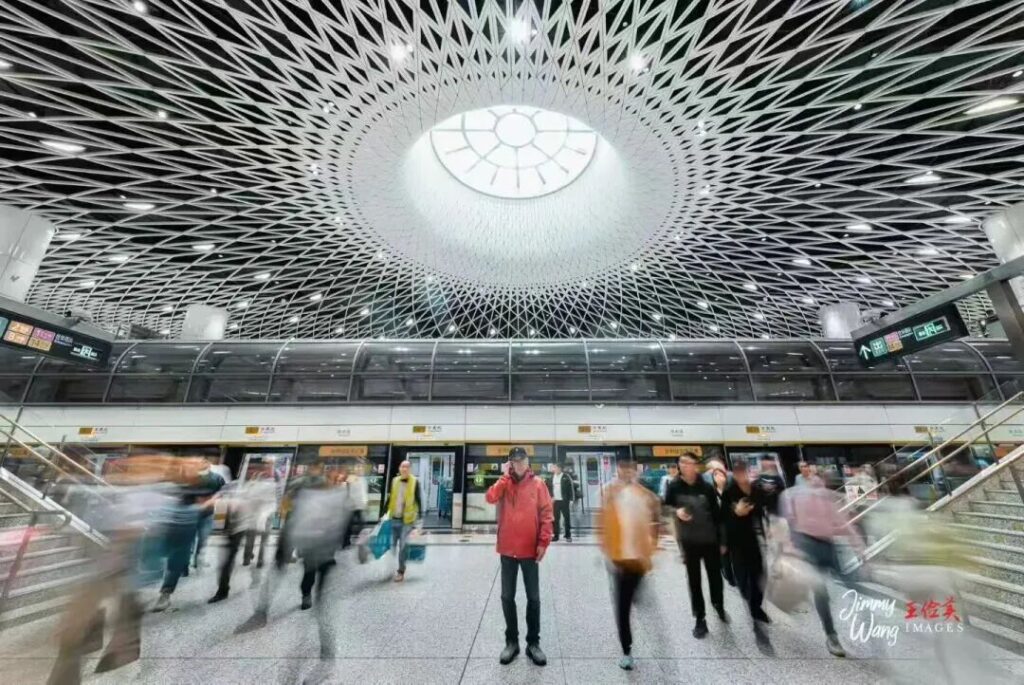 深圳行摄( 之六 )。惊艳的深圳岗厦北站“深圳之眼”手机随拍。天光倾泻,穿透巨大的圆形脉络,将地下空间沐浴成通透明亮的幻境。透明中庭之下,列车如时光梭般呼啸划过,曳出一道流动的银光。