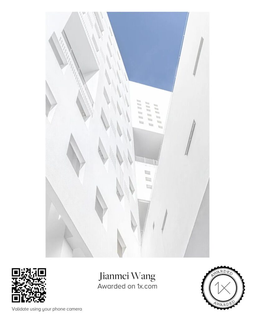 尝试拍摄建筑物极简作品,竟然在“1x.com”拿了个奖!取名《向上之间》(Between the Skyward Lines),两侧纯白建筑向上延伸,像一条狭长的“白色峡谷”,顶端留出一块清透的蓝天,成为画面中唯一的色彩与呼吸。要表现极简、安静、有力量。图2。