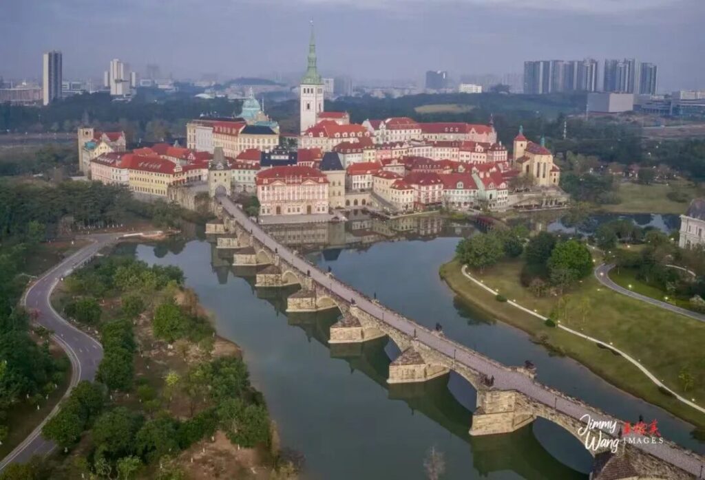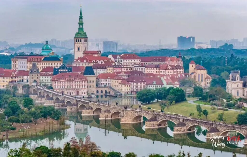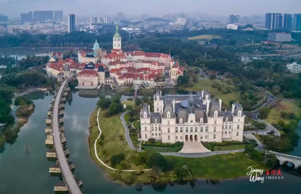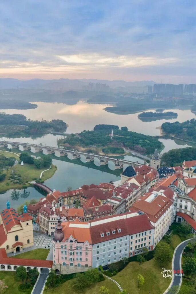 深圳航拍地摄(之三)。薄雾正散,山水初醒,在青山与湖泊之间,静谧而庄重的建筑群缓缓浮现,红瓦白墙,欧式建筑错落有致,仿佛一座来自欧洲的学术小城,却稳稳扎根在中国南方的大地之上。