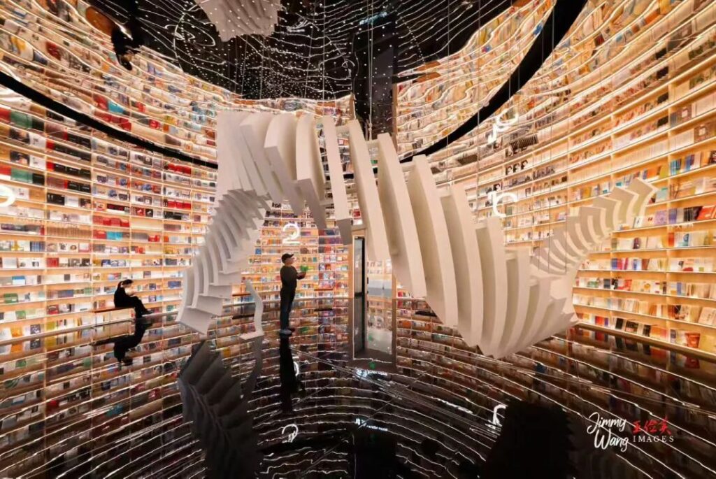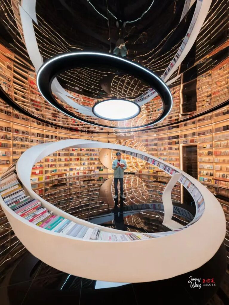 【第一张】现代书店内部,书墙环绕,空间如艺术装置。读者置身其中,仿佛走进知识与想象交织的世界。