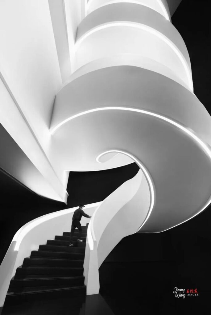 【第二张】黑白画面中,螺旋楼梯如流动的线条向上延伸。人物拾级而上,空间简洁而富有力量感。