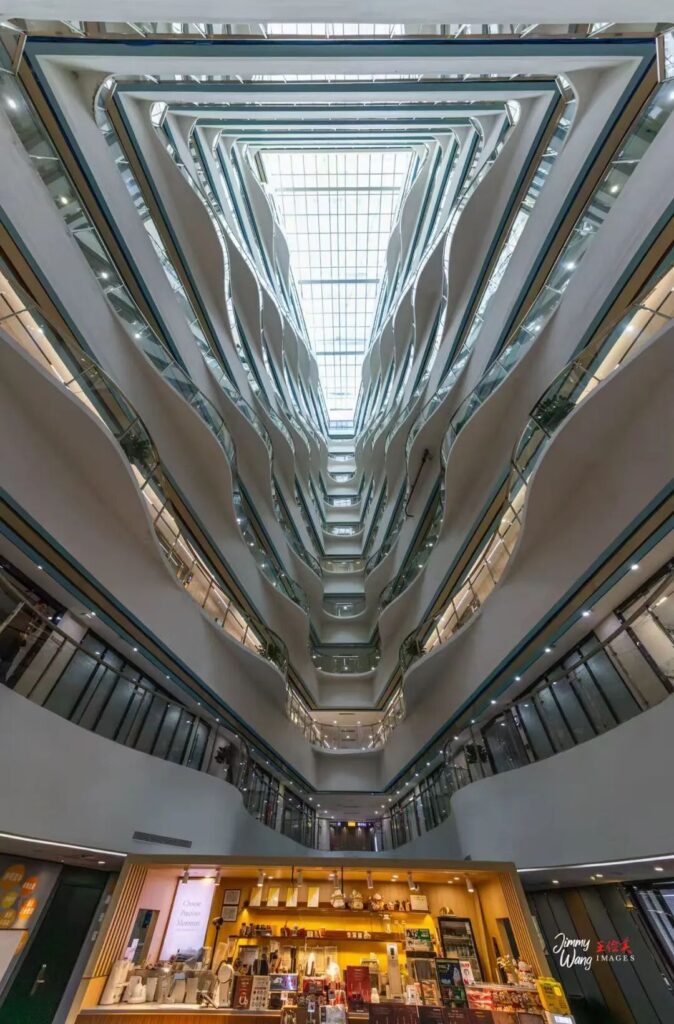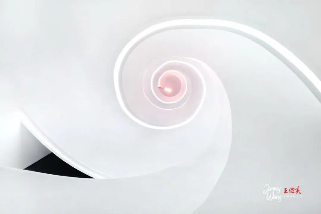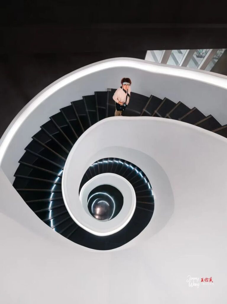 俯瞰旋转楼梯,线条流动而有节奏。行走其间的人,为理性的建筑增添了温度。