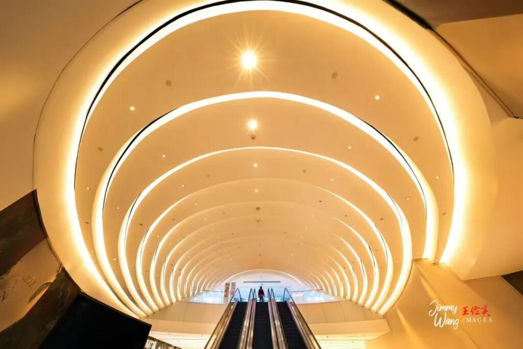 拱形灯带铺陈天花,暖光层层递进。自动扶梯向上延伸,展现深圳的现代气息与城市节奏。