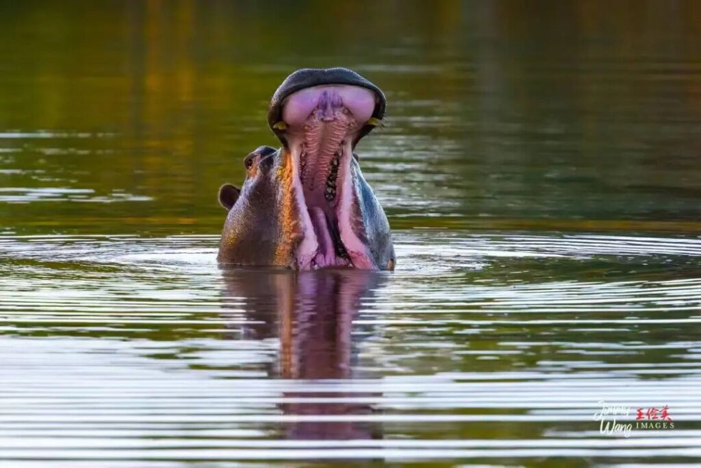 河马张开血盆大口,好像要吞掉整个非洲,气势惊人,水面波光粼粼;