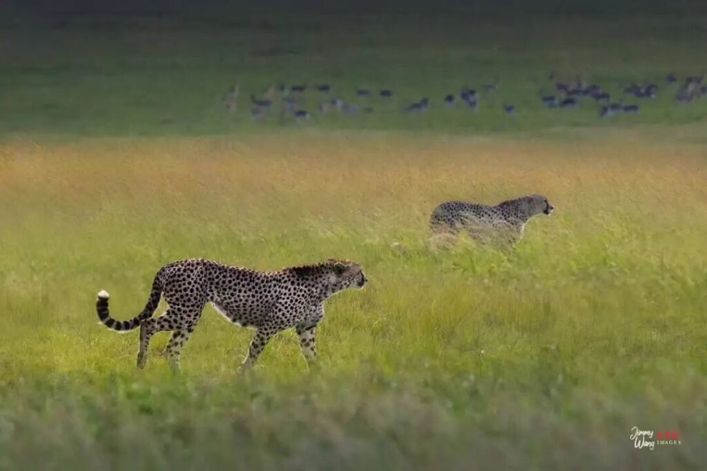第3张|两只猎豹降低身姿穿行绿色草地,前方远处可见一群羚羊,预示着一场潜在的狩猎故事等待揭秘。