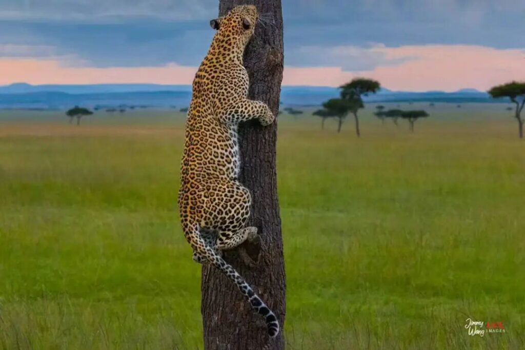 第4张|一只花豹攀附在笔直的树干上,豹纹在夕光的映照下熠熠生辉。