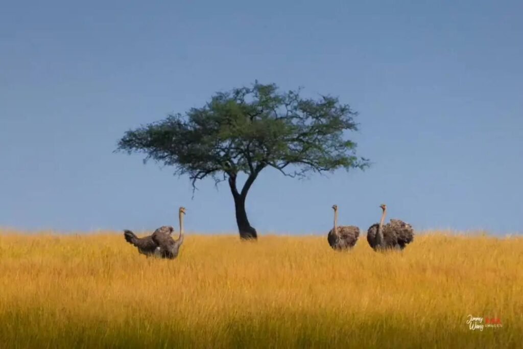 肯尼亚拍摄之旅·下篇(之五 )。图1,《鸵鸟与孤树》,几只鸵鸟在金黄色草原上悠然漫步,背景是一棵独立的金合欢树。