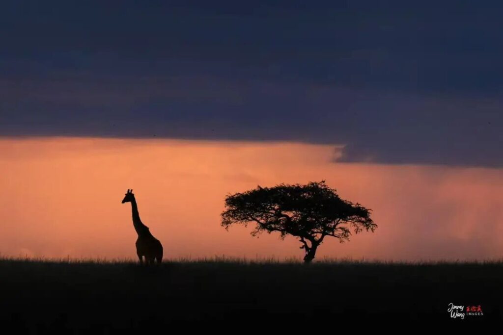 图2,《长颈鹿剪影》,夕阳余晖洒满天际,明暗对比强烈,长颈鹿静静地杵立,与树背立,成为明暗交错间的剪影诗行。