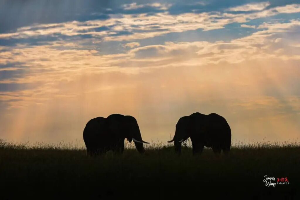 《非洲象双影》,两只非洲象在晨曦中对峙,天光透过云层,宛如舞台聚光灯般照亮它们的身影,宛如大地舞台的庄严序幕。