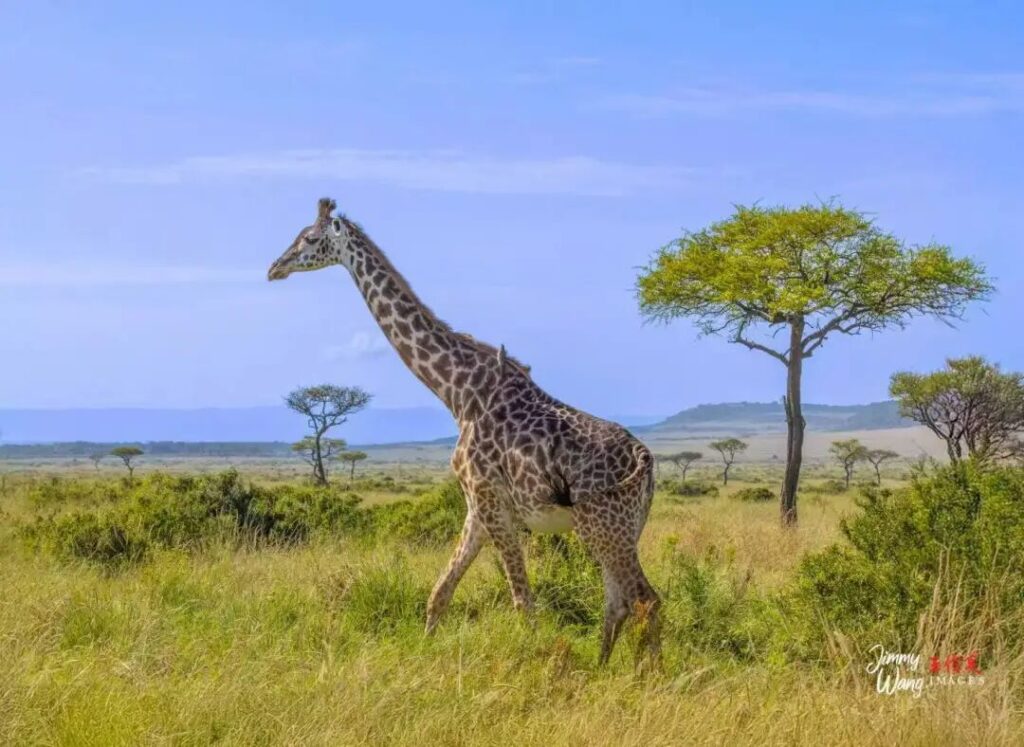 一只长颈鹿悠然步行在金黄草地上,身后是一棵高高的金合欢树和层层远山。
