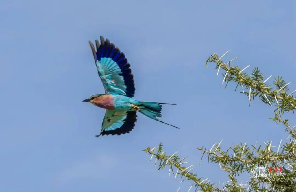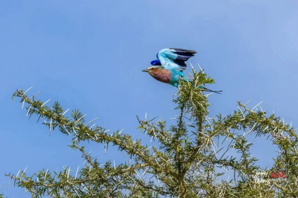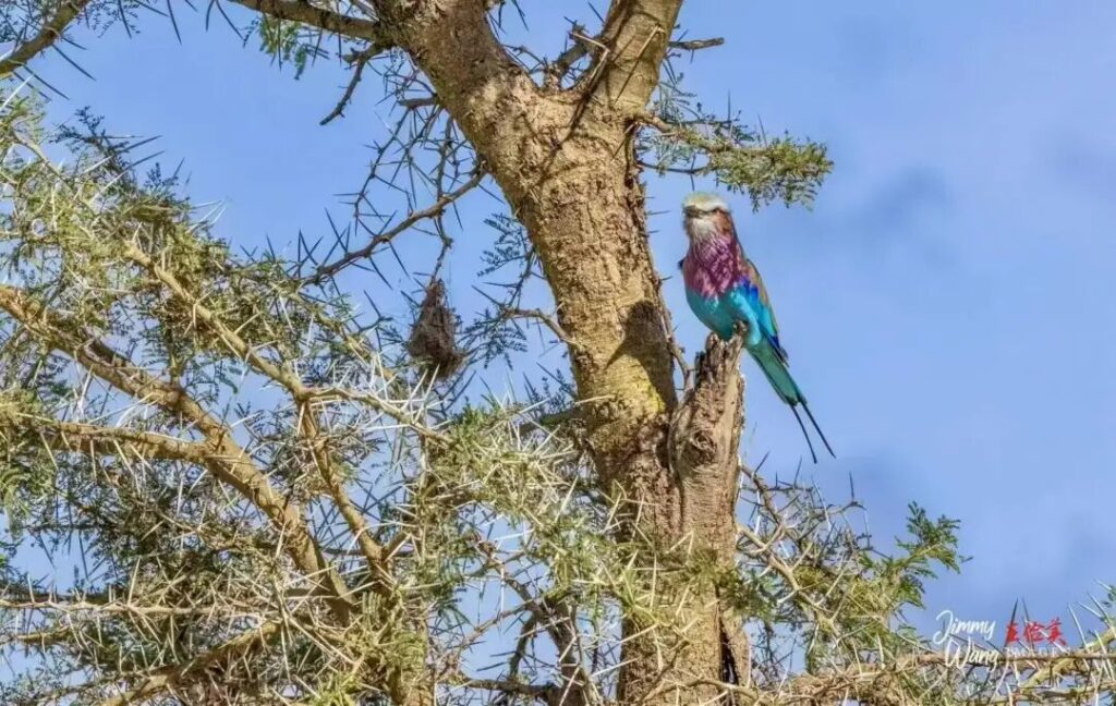 肯尼亚拍摄之旅·下篇(之二)。图1,一只佛法僧(Lilac-breasted Roller)栖息在粗壮的树干上,色彩斑斓,目光警觉,背景是长刺的灌木;